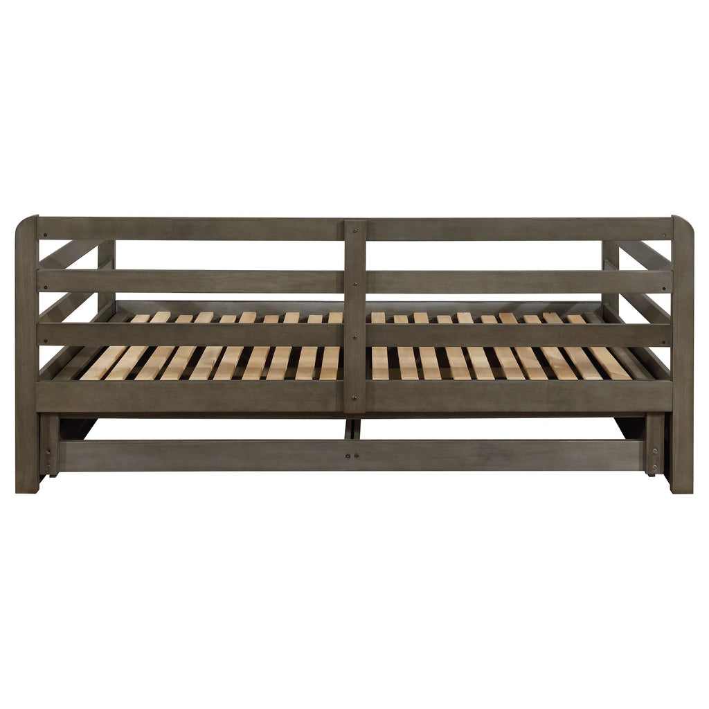 Bring function and fashion to your sleep space with this wood storage sleeper daybed. It is fashioned with pine, plywood, and MDF and is mattress-ready (no foundation required). Bed showcases storage footboard with two built-in drawers for linens and other items. You'll love the convenient fully slatted pull-out sleeper when guests stay over. It's perfect for any sleep space and is versatile enough for a tight living space like a loft, as well.