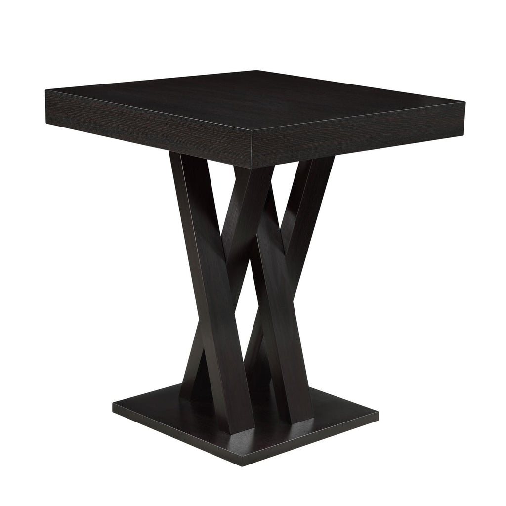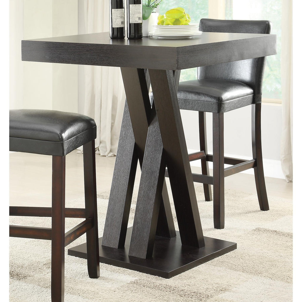 Amplify the style of an eat-in kitchen or dining nook with this gorgeous, contemporary bar table. A bold, crisscross design lends an updated twist to a classic silhouette. Sturdy supports blend appealingly with a handsome, square wooden top. A lovely, cappuccino-colored finish rounds out its charming appeal. Add four matching bar stools to create the perfect gathering space to eat, drink, and connect with your loved ones.