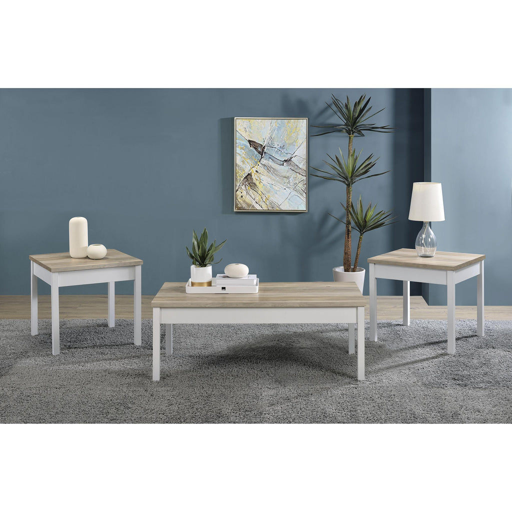 An updated version of farmhouse style is soft and easy on the eyes as this three-piece wood coffee table set is a viable option for your family room or living room. Casual and yet nicely designed, this set offers a versatile finish palette of distressed pine and white over wood products. Clean lines add an easy optical effect. Make your space a simple yet stylish venue with tables designed to last through redesigns. Set includes one rectangular coffee table and two end tables.