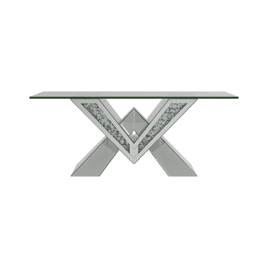 This mirrored coffee table serves as a stunning centerpiece with its bold design. The V-shaped base showcases mirrored panels and sparkling crystal accents for an opulent look. The rectangular, beveled tempered glass top adds elegance and practicality, making this table ideal for entertaining or displaying decor. A striking blend of luxury and modern aesthetics, it elevates any living space.