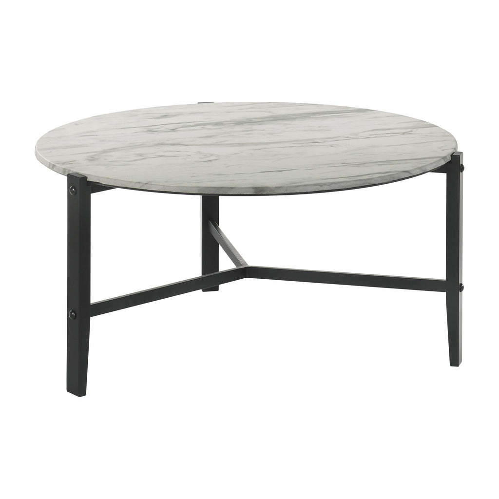 Create a minimal aesthetic in your living room with this modern coffee table. Slim black solid rubberwood legs form a stand-like base that supports a spacious round top. The high-pressure laminate top features a faux white marble design with textured striations for added realism. Scratch-resistant, burn-proof, and break-proof, this coffee table offers a durable and stylish surface for decor, beverages, or everyday essentials, blending effortlessly into contemporary spaces.