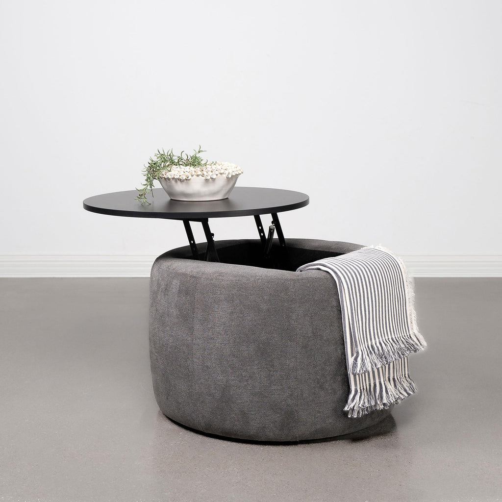 Indulge in the seamless blend of functionality and style with this chic round ottoman. Draped in sumptuously soft grey chenille, it invites relaxation while concealing a spacious storage compartment beneath its sleek black lift-top. Its subtle charm is elevated by the contrast of textures, offering an understated yet sophisticated accent to any living space. Perfect for small spaces, this ottoman combines the comfort of additional seating with the practicality of hidden storage. Envision this versatile piece as the focal point in your room, where convenience meets modern elegance.