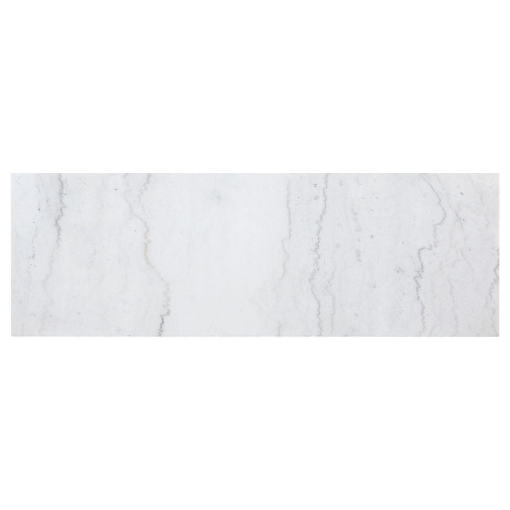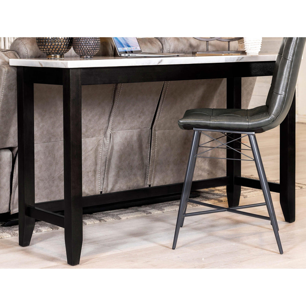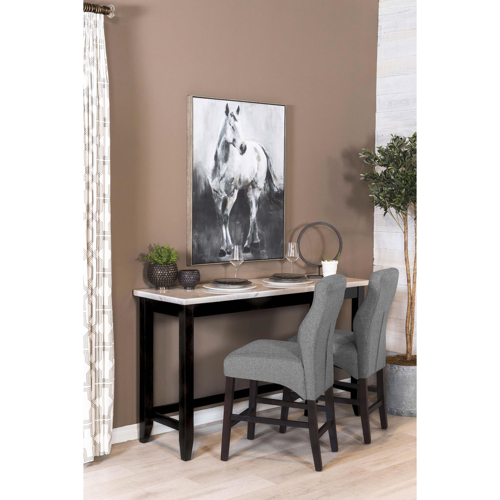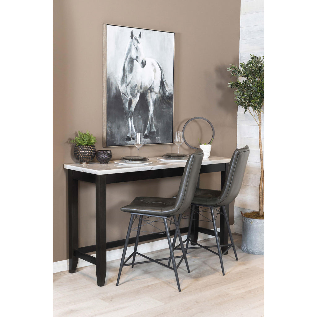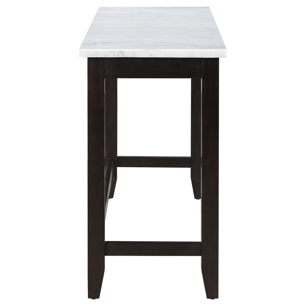 Create a breakfast bar in your kitchen nook with this modern counter height table. Designed with a striking color combination, a rustic espresso trestle base lends a dramatic touch and grounds the room elegantly. Gather friends and family around the long white marble top and bring in coordinating counter stool of your choosing. Thick, straight legs elevate the counter height top, allowing you to slide stools or chairs beneath when not in use. A wonderful addition for sophisticated dining experiences, brunches, and beyond.