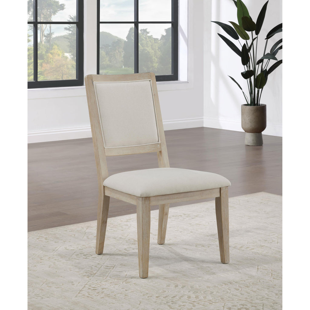 Plus foam and soft upholstery are a perfect complement to the inviting casual charm of a set of two modern farmhouse dining chairs. They feature squared backs with straight, tapered legs for a clean, precise look and feel. They boast wood framing complete with a white finish. The white is treated with wire brushing, creating a distressed, lived-in ambiance. Upholstery is a soft beige, perfect for versatility in a variety of kitchen and dining room settings.
