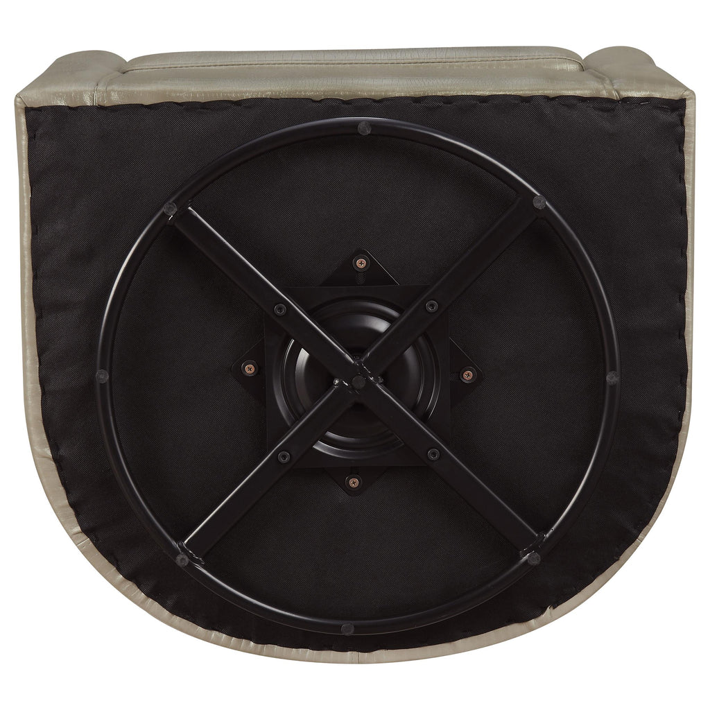 Bring a casual elegance to your contemporary living space. Comfort and style go hand in hand with this gorgeous swivel accent chair. A hint of retro design sneaks in to a barrel back minimalist profile wrapped in stunning champagne leatherette upholstery. A slight sheen gives off radiance and energy, making this chair a fresh addition to a casual space. Swivel motion provides added convenience.