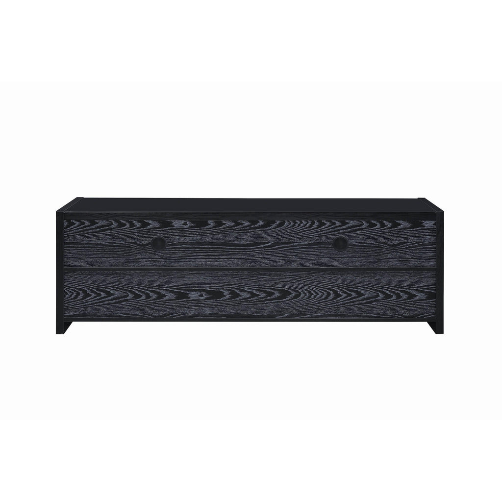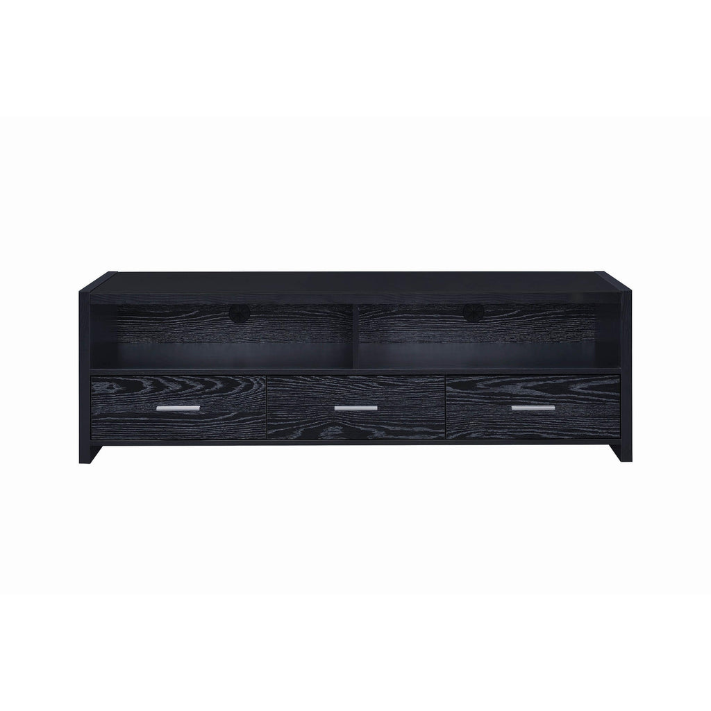 Sleek and modern, this TV console is a stylish choice. Exquisitely crafted from black oak, it boasts a classy, contemporary appeal that looks lovely in a den or family room. Brushed silver hardware creates a striking contrast to its bold, black finish. Three large drawers and two spacious compartments offer plenty of storage for electronics, games, movies, and more. Whether you're gathering loved ones for movie night or enjoying a gaming marathon, this console provides hours upon hours of entertainment.