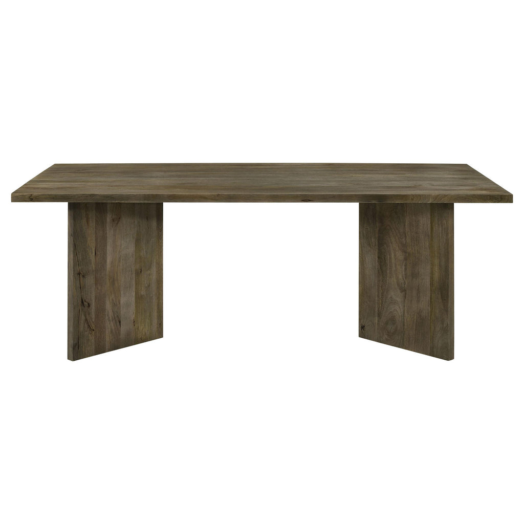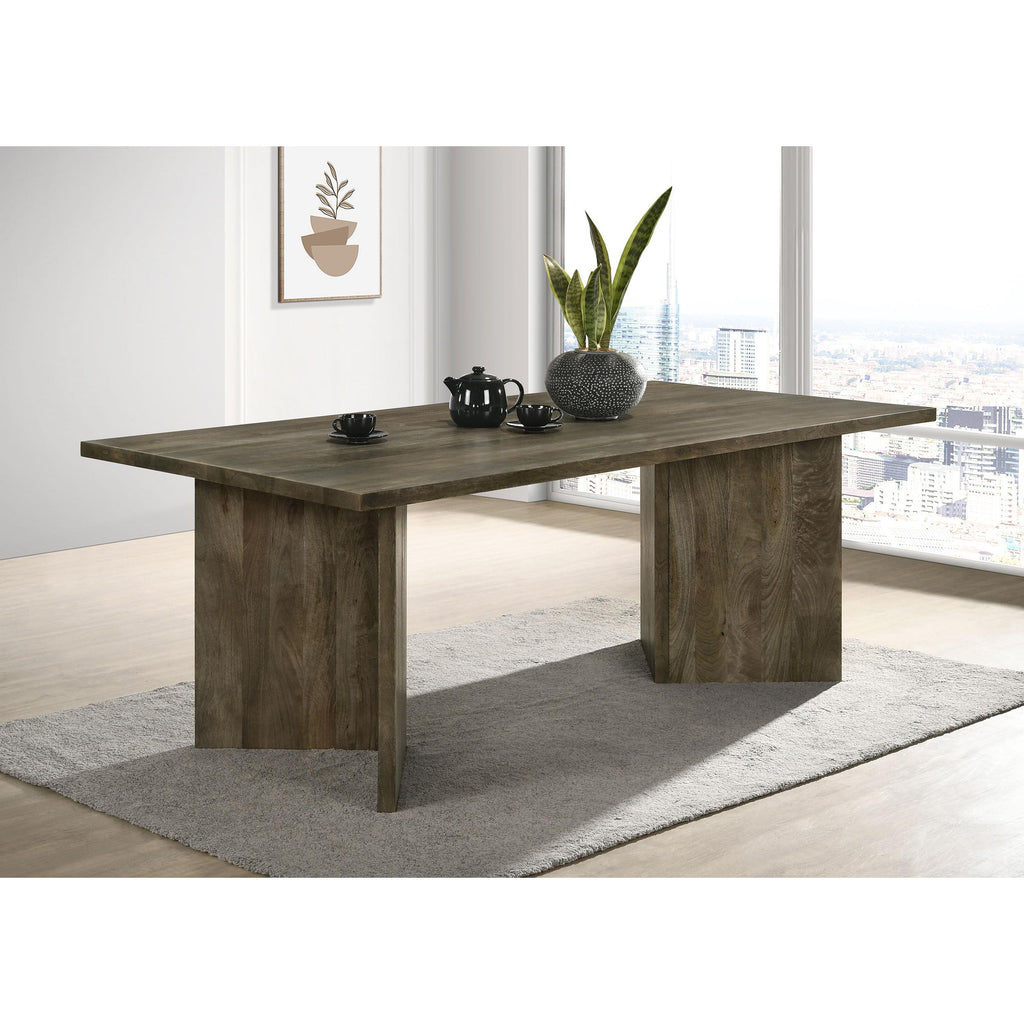 Introduce a modern and eco-friendly statement piece to your dining room with this exquisite mango wood dining table. Crafted from sustainable mango wood, it showcases a sharp V-shaped base and an architectural silhouette that adds a touch of contemporary flair.
