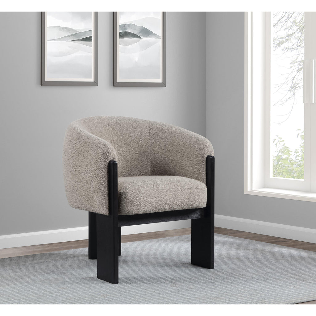 Bring updated style and sophistication to your living room or den with a modern accent armchair. It boasts an inviting rounded silhouette with sloping arms. Three legs in a black finish add a sculptural sensibility. Textured boucle upholstery creates rich texture and depth, perfect for entertaining or lounging. Enjoy the plush softness of foam cushions in any setting.