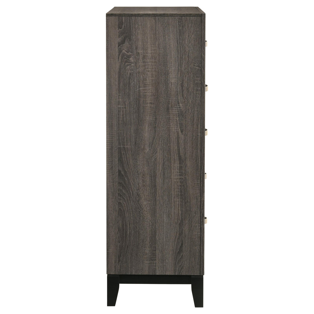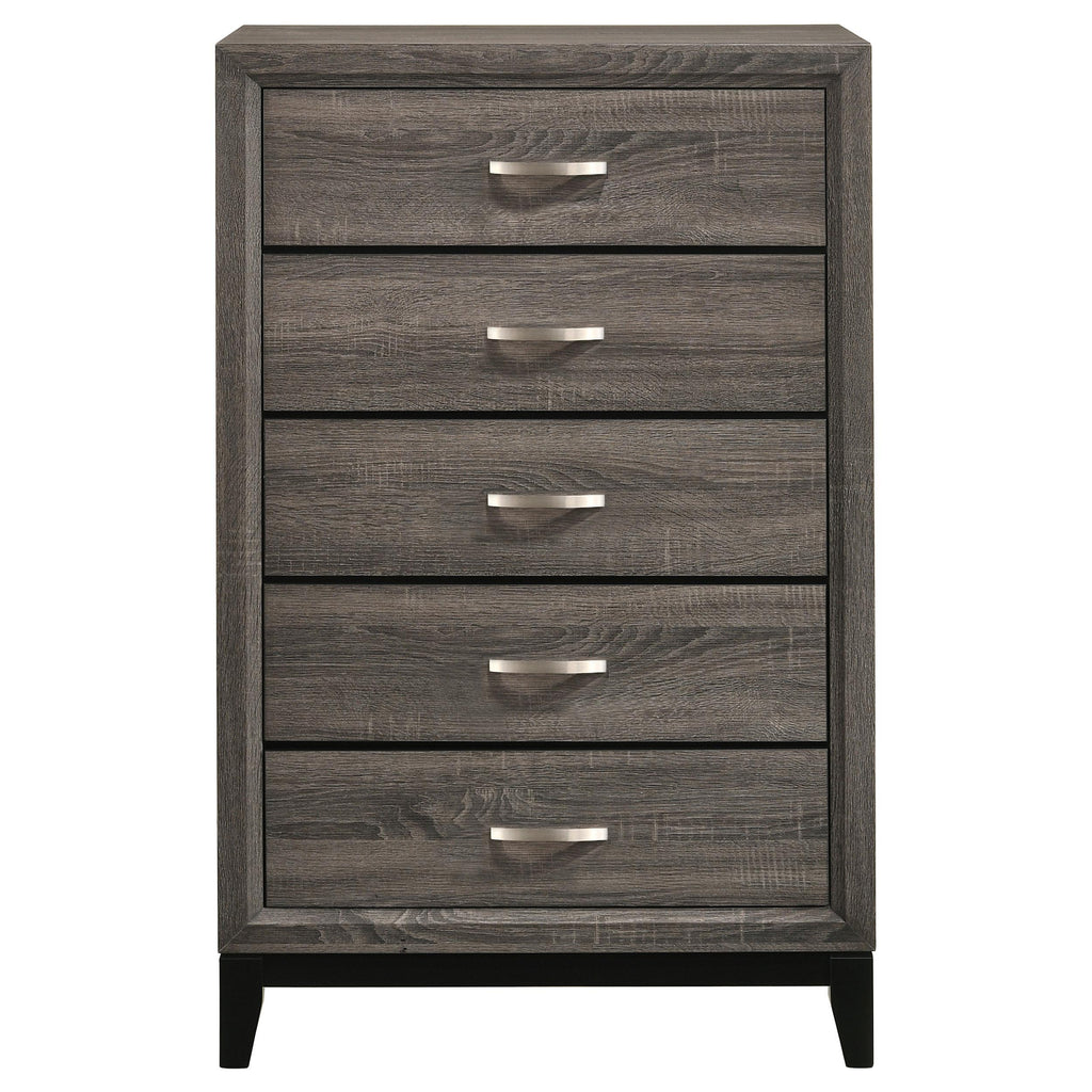 Complete a retro motif with the fine details and color blocking from this grey five-drawer chest. Constructed of oak, the body showcases a light, exposed wood grain that oozes sophistication. Tapered legs in a black finish offer a modern feel, adding visual intrigue with neutral hues. Bright and metallic, light drawer pulls curve off the flat drawer fronts in a half moon shape. A contemporary take on mid-century modern design, add fun flair to an up-to-date scheme.