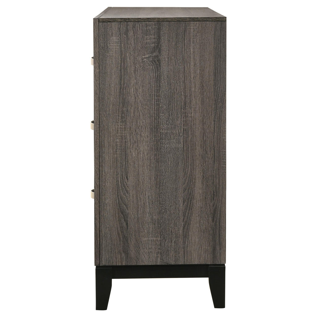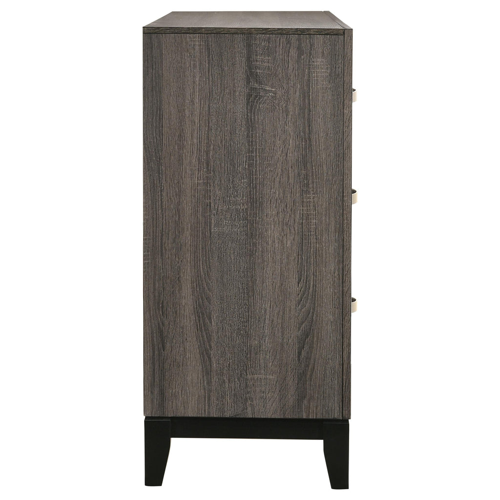 Featuring color blocking, this grey six-drawer dresser is a contemporary take on mid-century modern design. The body showcases a sophisticated, exposed wood grain constructed of oak. Tapered legs in a black finish offer a modern feel, adding visual intrigue with neutral hues. Bright and metallic, light drawer pulls curve off the flat drawer fronts in a half moon shape. Complete a retro motif, or add fun flair to an up-to-date scheme.