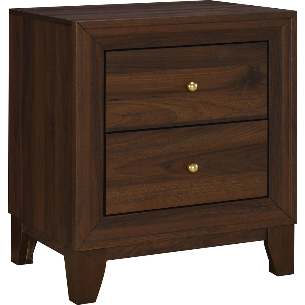 Create a chic, inviting retreat from the world with this modern wooden bedroom set. In a rich walnut wood finish, it imparts sophistication with a padded, upholstered headboard on the bed and drawers that are dotted with gold finish round knobs. The bed is complete with plush foam cushioning and taupe fabric, and features a tall headboard paired with a low footboard for an open look in your bedroom. Storage pieces add an austere, refined look with mitered trim work and tapering legs that add angularity. The set is crafted with durable engineered wood and features laminate surface that resist dents and scratches from everyday use to maintain a fresh, beautiful look.
