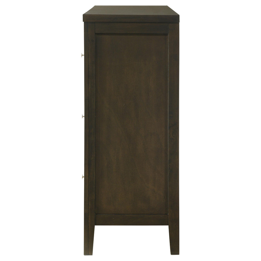 This six-drawer dresser offers generous storage and sophisticated style, making it an essential addition to any modern bedroom. The dark cocoa finish highlights the clean lines and vertical details, adding depth and character to the piece. The drawers are fitted with brushed nickel hardware, giving the dresser a sleek, contemporary look. Each drawer operates smoothly on center metal glides, providing easy access to your wardrobe. Constructed from solid Asian hardwood and tropical wood veneers, this dresser blends function with timeless style.