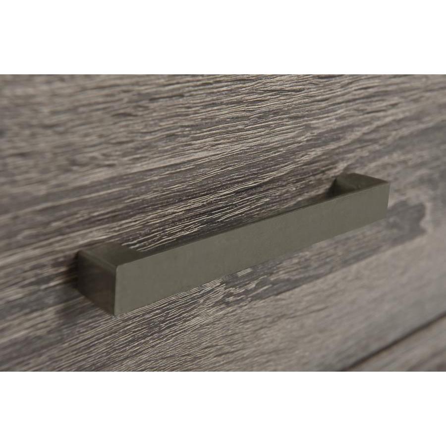• A brown oak wood grain finish is complemented with metal bar handles that add a touch of contrast