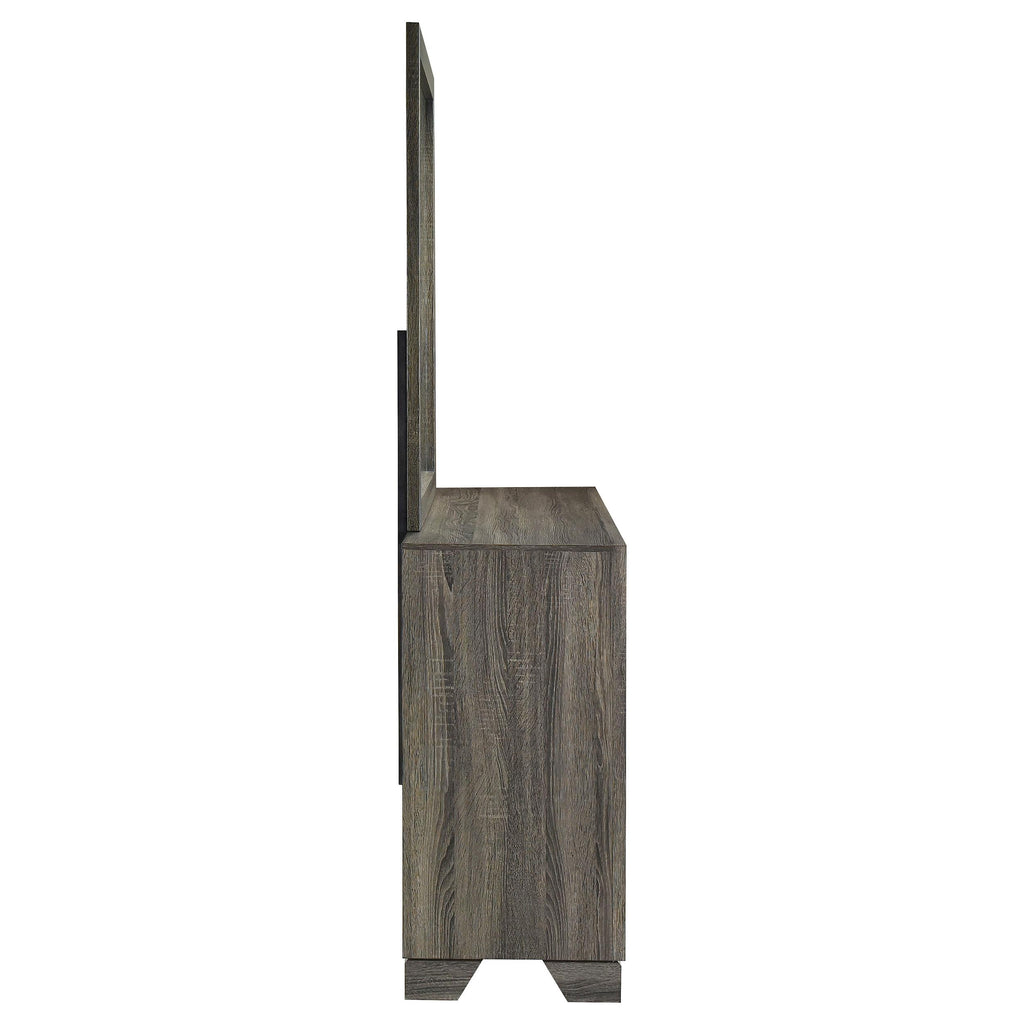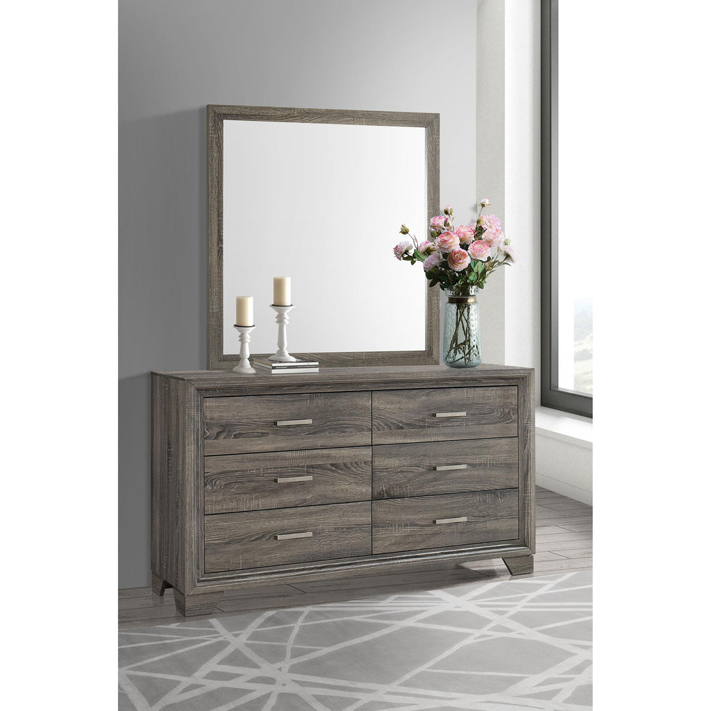 Complete your bedroom storage ensemble with the roomy space in this transitional six-drawer dresser with a framed mirror that attaches directly to the back of the dresser. It boasts a brown oak wood grain finish over laminate surfaces, creating a stylish look that resists everyday wear and tear. The dresser delivers roomy storage in drawer with smooth metal glides and bar pulls, adding the perfect hint of contrast and depth. Mitered trim adorns the front of the case and complements the frame on the mirror to create a sense of angular precision. Use the wide top for a jewelry box and a vase of flowers, or select decor that brings personalized aesthetics to your inviting bedroom.
