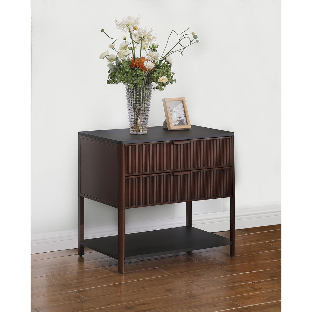 Enhance your living space with this versatile side table, which can also serve as a stylish bedside table. Its two spacious drawers feature elegant fluted detailing, adding texture and sophistication to your décor. The sturdy metal frame, finished in a rich hue, ensures durability, while the lower open shelf provides convenient storage or display space. Whether beside your bed or next to a sofa, this table effortlessly blends practicality and style. Its sleek design and functionality make it an essential piece for both modern and traditional settings.