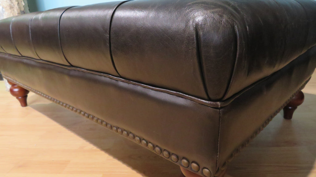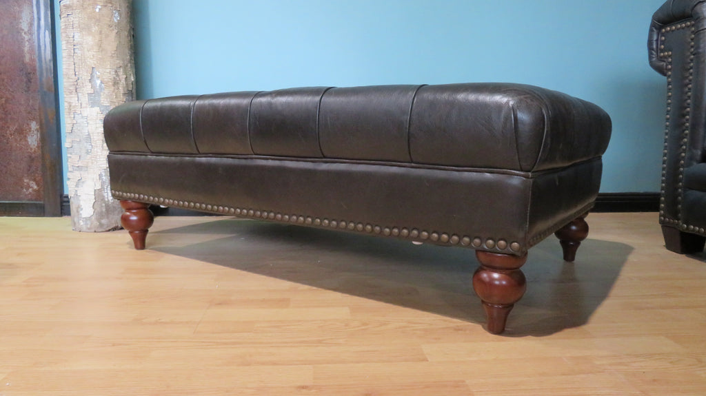 A luxury black top grain leather tufted with split leather on the sides. This beautiful piece has steel studded nailhead trim all the way around the bottom with spindled turned legs. This piece is a 50” length x 30” width x 18” height. Amaxleather is a high-quality leather furniture provider serving the North American market since 2006.