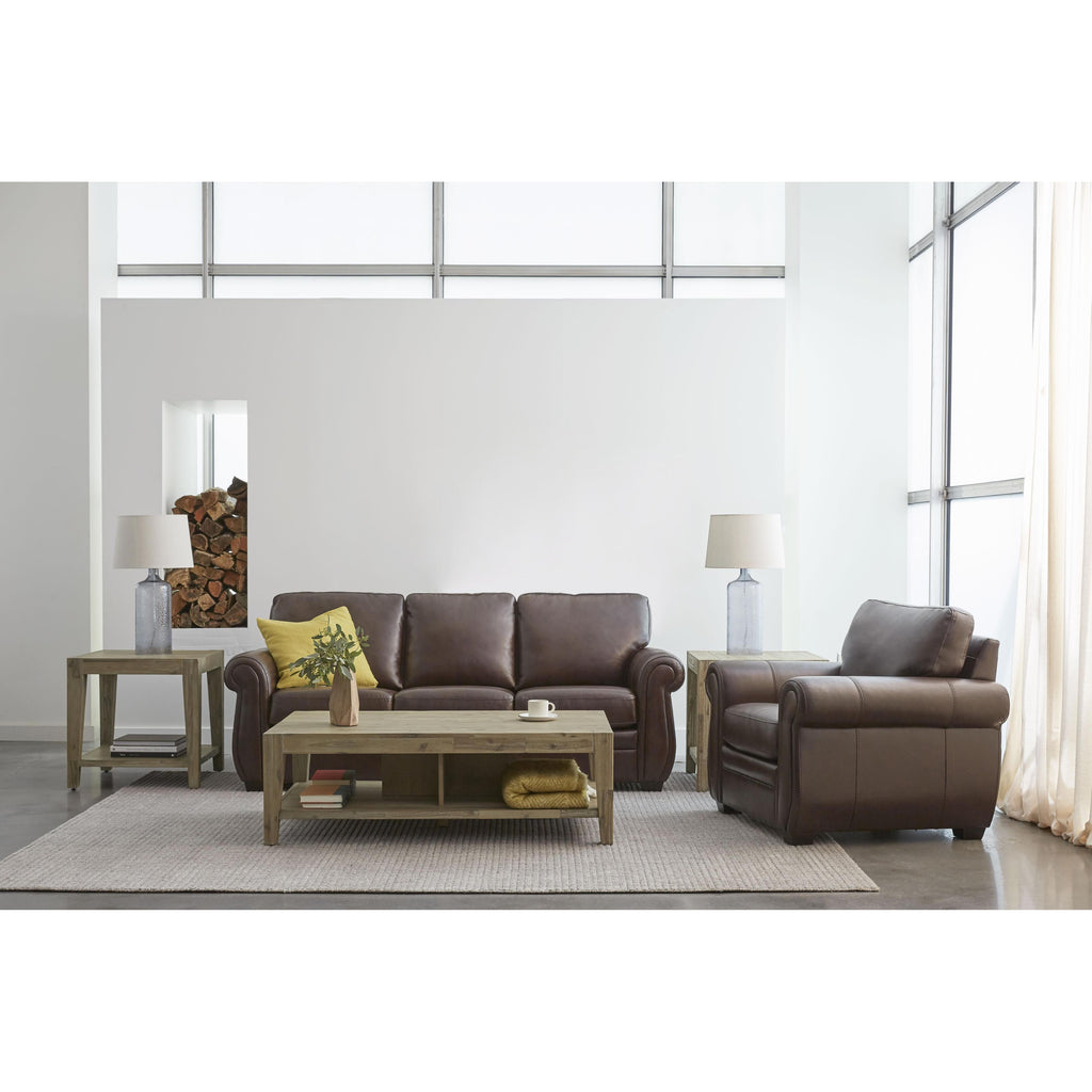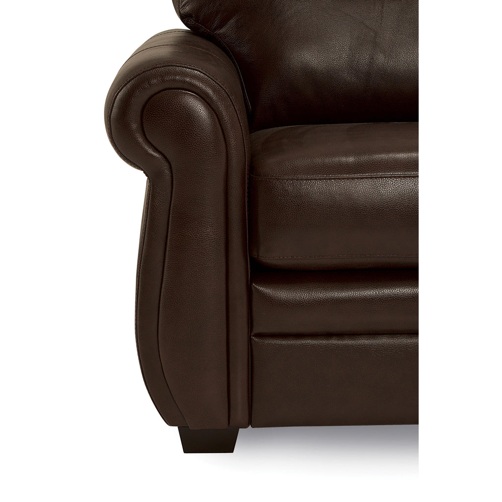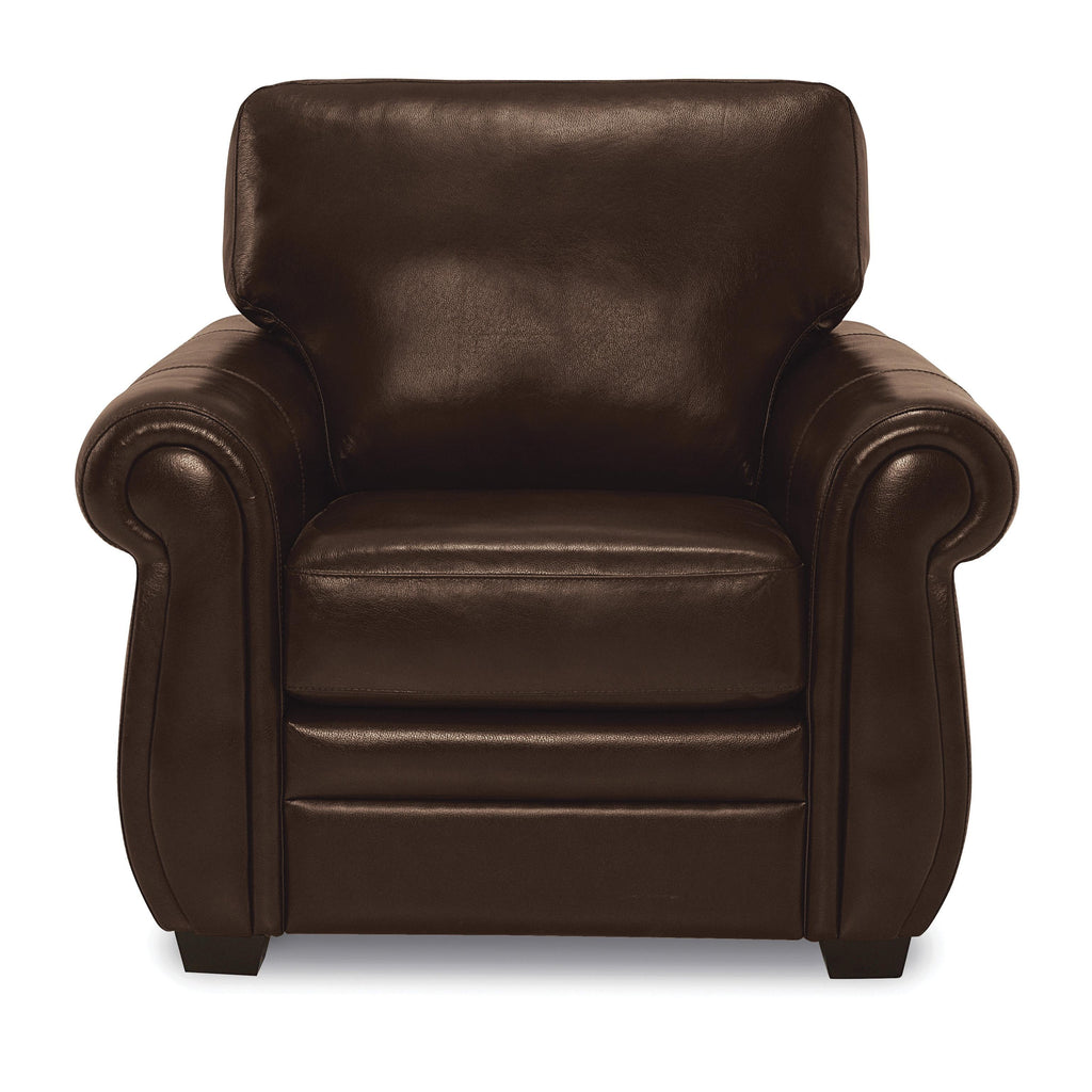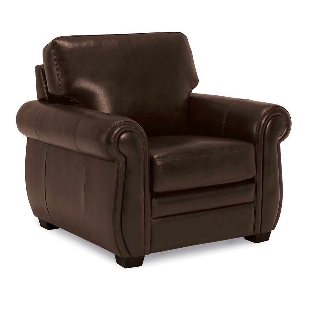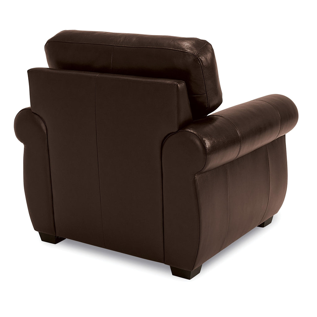 This Borrego chair doesn't skimp on charming traditional style. The seating construction is framed by an exaggerated rolled arm detail. Luxurious leather upholstery is accented by topstitching in Walnut. A blown-fibre back cushion and foam seat create a comfortable and welcoming seating experience. With its distinctive shape and classic construction, the Borrego chair will bring an air of easy elegance to any living space.