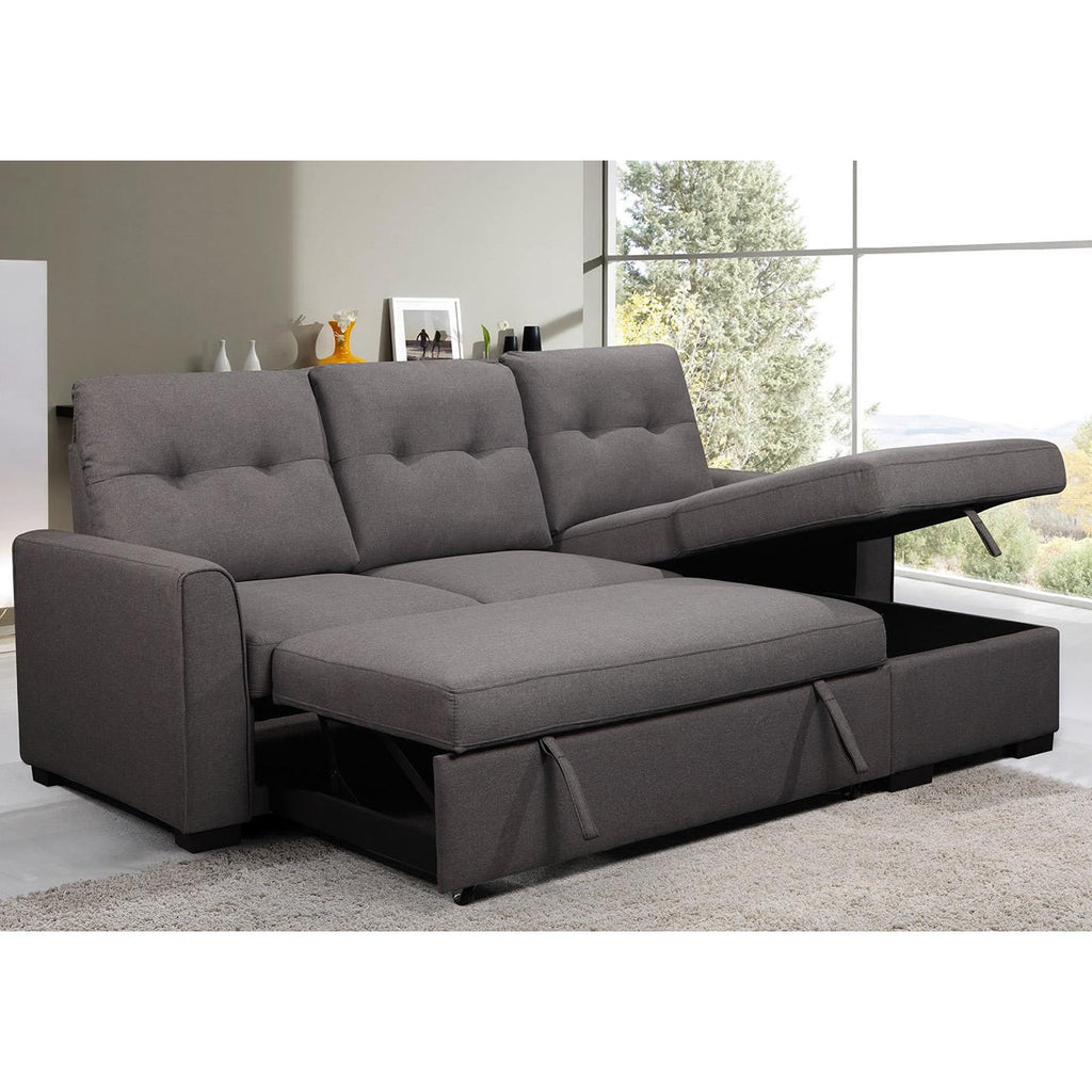 This Fiorenzo contemporary multi-functional sectional and sleeper ensemble quickly and easily converts to a large flat sleeping surface, with storage in the base of the chaise. The set comes in slate upholstery. It includes an LHF loveseat and an RHF chaise.
