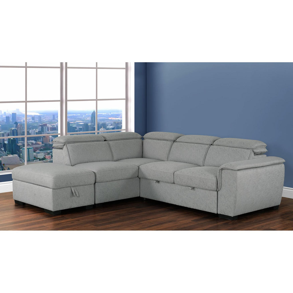 This Venetian Gerardo contemporary multi-functional sectional and sleeper ensemble quickly and easily converts to a large flat sleeping surface. Additional features include adjustable headrests and a storage ottoman. It comes with an LHF chaise, an RHF loveseat, and an ottoman.