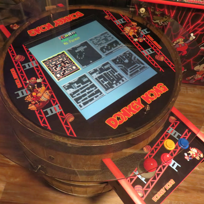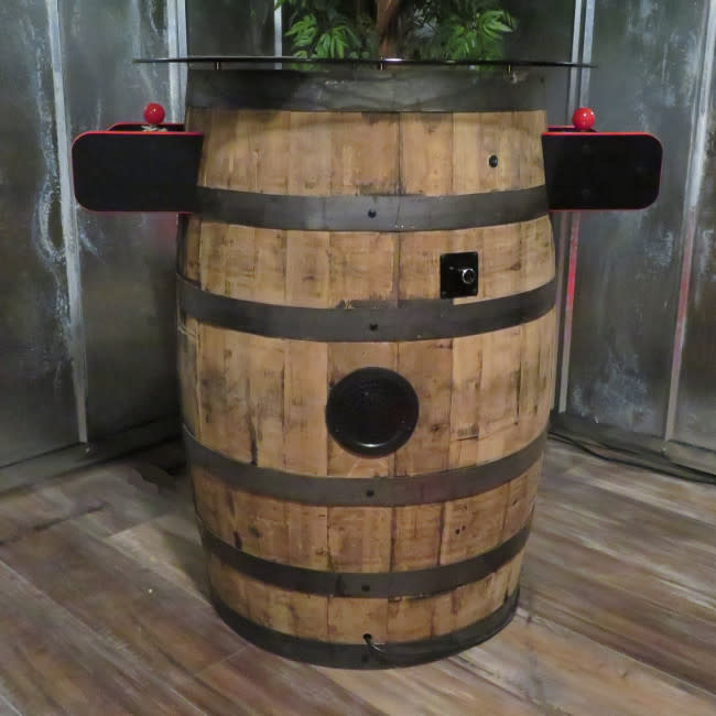 The Whiskey Barrel Donkey Kong Edition is sure to deliver on plenty of fun. Those favorites such as Pacman, Ms Pacman, Frogger, Donkey Kong, Galaga, Space Invaders and more are sure to walk you back down memory lane as 60 games are included. This is a reclaimed aged Whiskey Barrel that serves a dual purpose not only for playing your favorite retro games but also as a tempered glass top that is made for use to sit your favorite beverage on.